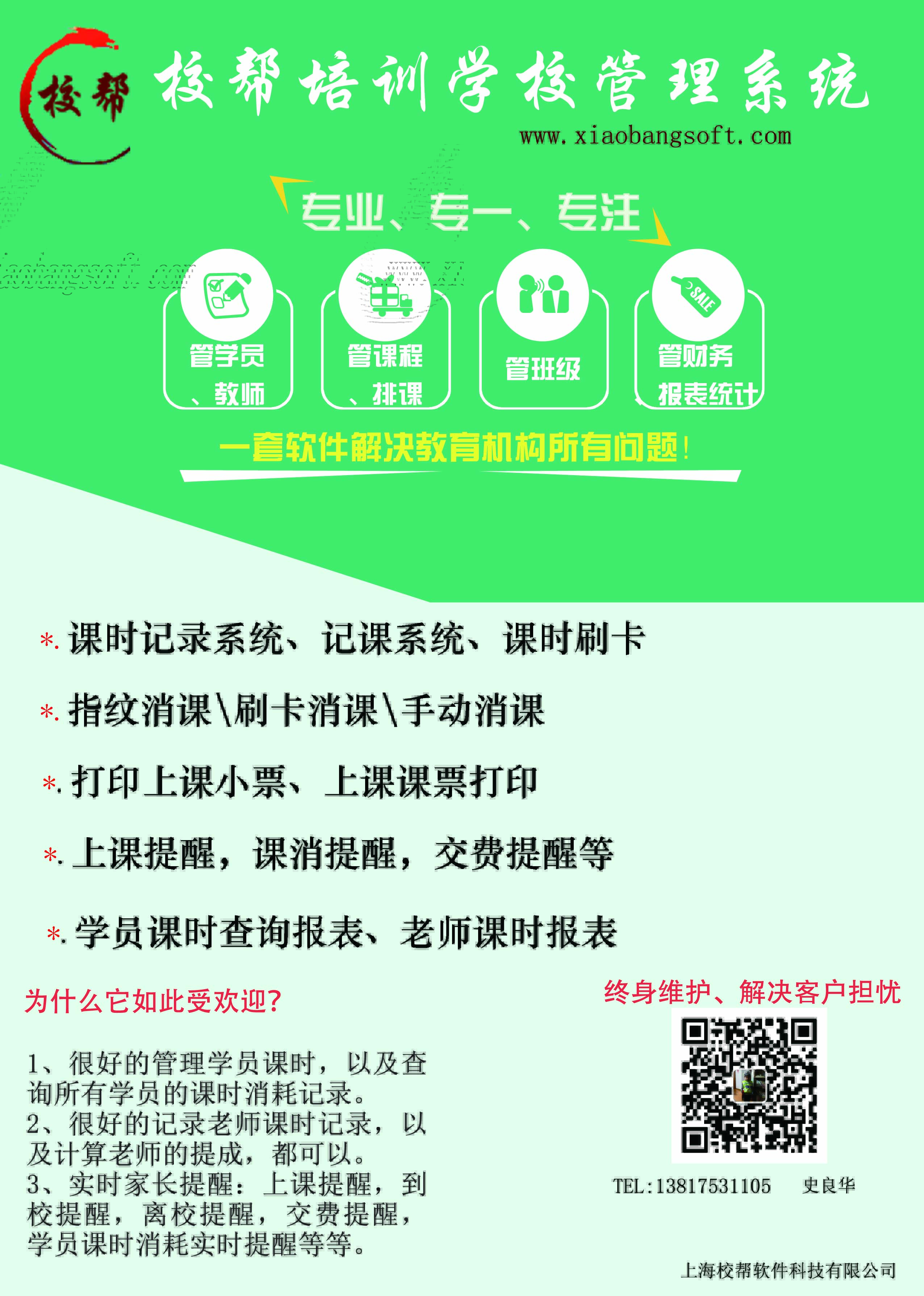 校帮教培管理系统帮您管理学员课消、学员记课、课时登记系统、手动随时消课、刷卡消课、指纹消课、学员信息管理、上课前提醒、课消提醒、交费成功提醒、学员课时查询、教师课时查询、学员手机端查看课消情况、打印上课小票等服务。